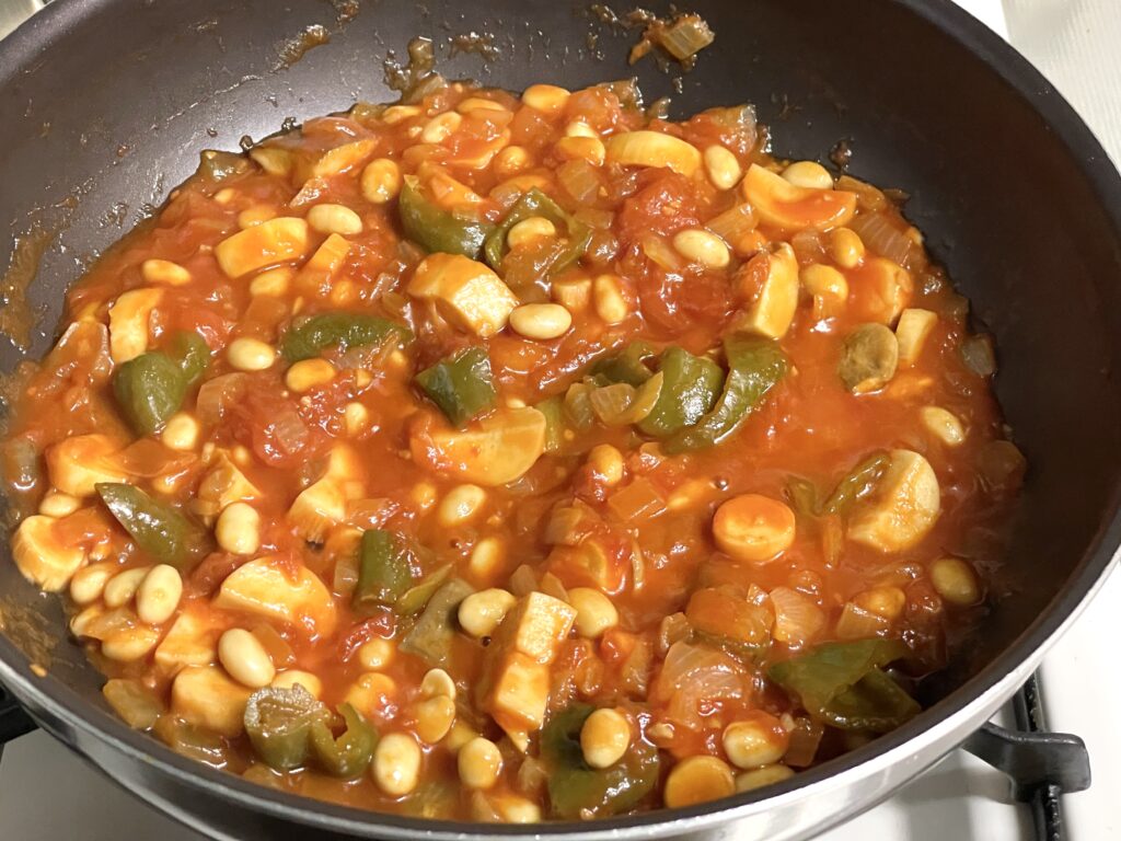 ③ ②の野菜が炒まったら、トマト缶、コンソメキューブ、水煮大豆、水100mlを加えて蓋をして煮込む。弱い中火で約10分程度。
